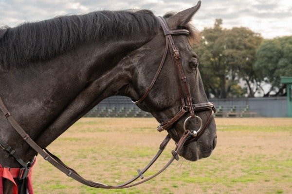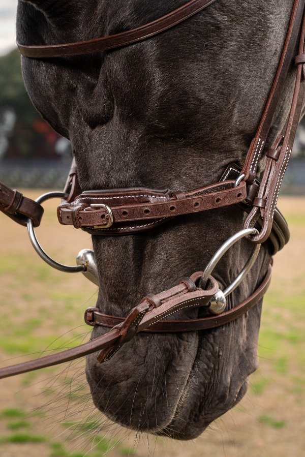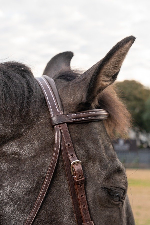 Cabezada de cuero para salto. Con muserola ancha y plantillado. Tamaño Full.